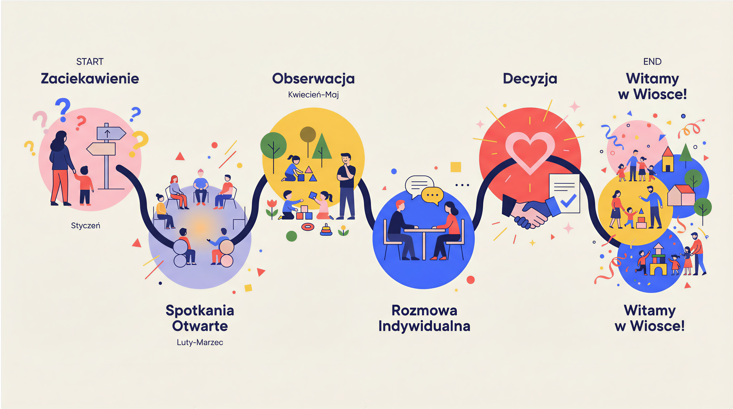 Proces rekrutacji w Wioskach opiera się na budowaniu zaufania i dopasowania wartości. Naszym celem jest stworzenie długoterminowej wspólnoty, a nie tylko rocznej "kohorty klientów" . Wierzymy, że spowolnienie procesu jest naszą przewagą, ponieważ pozwala Rodzicom poczuć, zanim zdecydują.